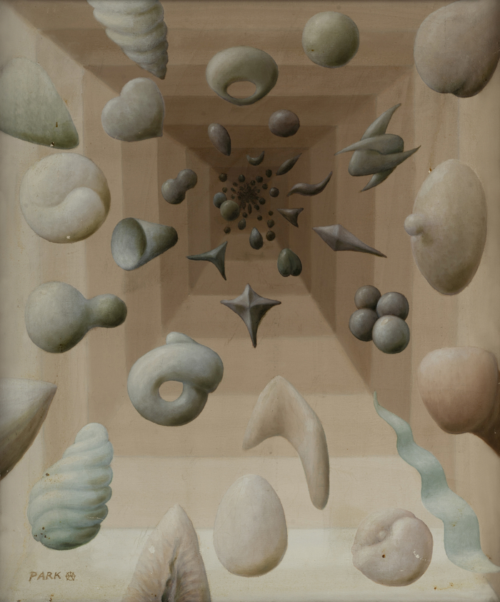 초현실주의 오브제에 대한 이론적 연구를 자신의 작업에 적용했던 박광호는 서울대 회화과를 졸업한 뒤 고향인 대구로 돌아와 30여 년간 대학에서 교편을 잡았지만 미술계와의 교류에는 소극적이었다. 그에게 초현실주의 회화는 억압된 정념과 물신숭배적 욕망을 적나라하게 드러내는 창구였다. 1970년대부터 1980년대까지 ‘결(結)’ ‘향(響)’ ‘음양(陰陽)’ ‘요철(凹凸)’ ‘군집(群集)’ 등 연작을 통해 화면 속 오브제 형태로 인간의 욕망을 표출했다. 전시작 ‘음양’(1970년대 중반)에는 여성의 가슴, 입술, 성기, 고대 어패류 화석, 암모나이트, 분열하는 세포 등 다양한 오브제가 명암과 깊이감 있는 공간감을 통해 마치 블랙홀에 빨려들어가는 것처럼 연출돼 꿈과 현실의 경계를 허문다.